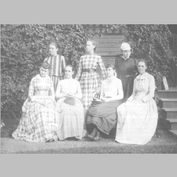 p5649 People group portrait Mary North Mary English A. Merrit A. Barron D. Buer Costumes Nineteenth Century Women ca. 1885 Photo by Schaidner