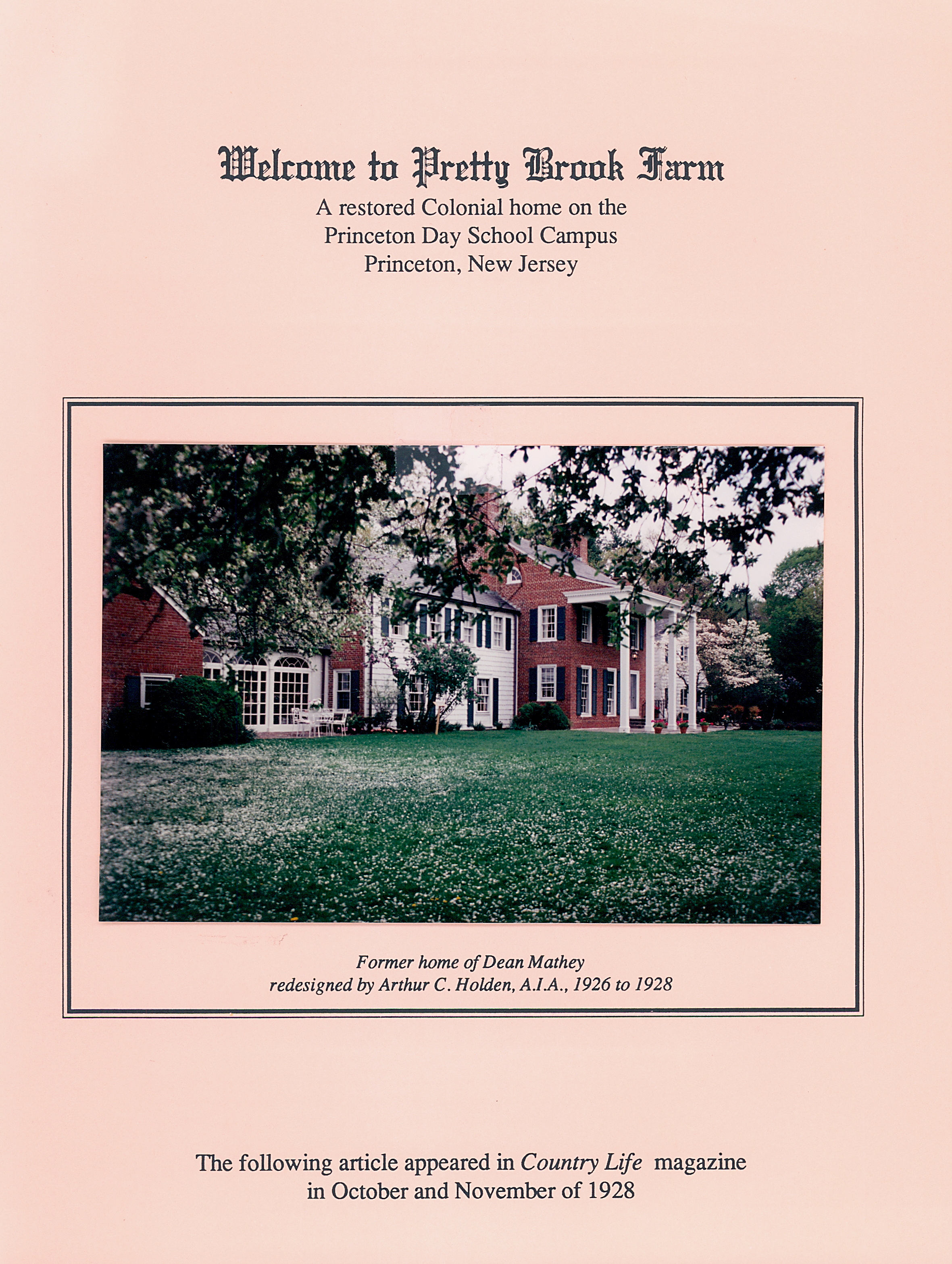 In 1930, Princeton Junior School moved into a new building it had built on Broadmead on land leased from Princeton University. The school was renamed Princeton Country Day School and remained at that location until the merger in 1965.