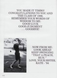 YOU MADE IT TIMBO! CONGRATULATIONS TO YOU AND THE CLASS OF 1996. REMEMBER YOUR WORDS OF WISDOM TO ME: GOOD LUCK GOOD JUDGMENT .... GOODBYE! NOW FROM ME: LOOK AHEAD KEEP SWINGING “ THAT A PEACH, HUN.” LOVE, YOUR SISTER, KATE - ’94 110