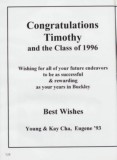 Congratulations Timothy and the Class of 1996 Wishing for all of your future endeavors to be as successful & rewarding as your years in Buckley Best Wishes Young & Kay Cha, Eugene ’ 93 128