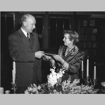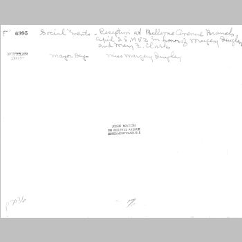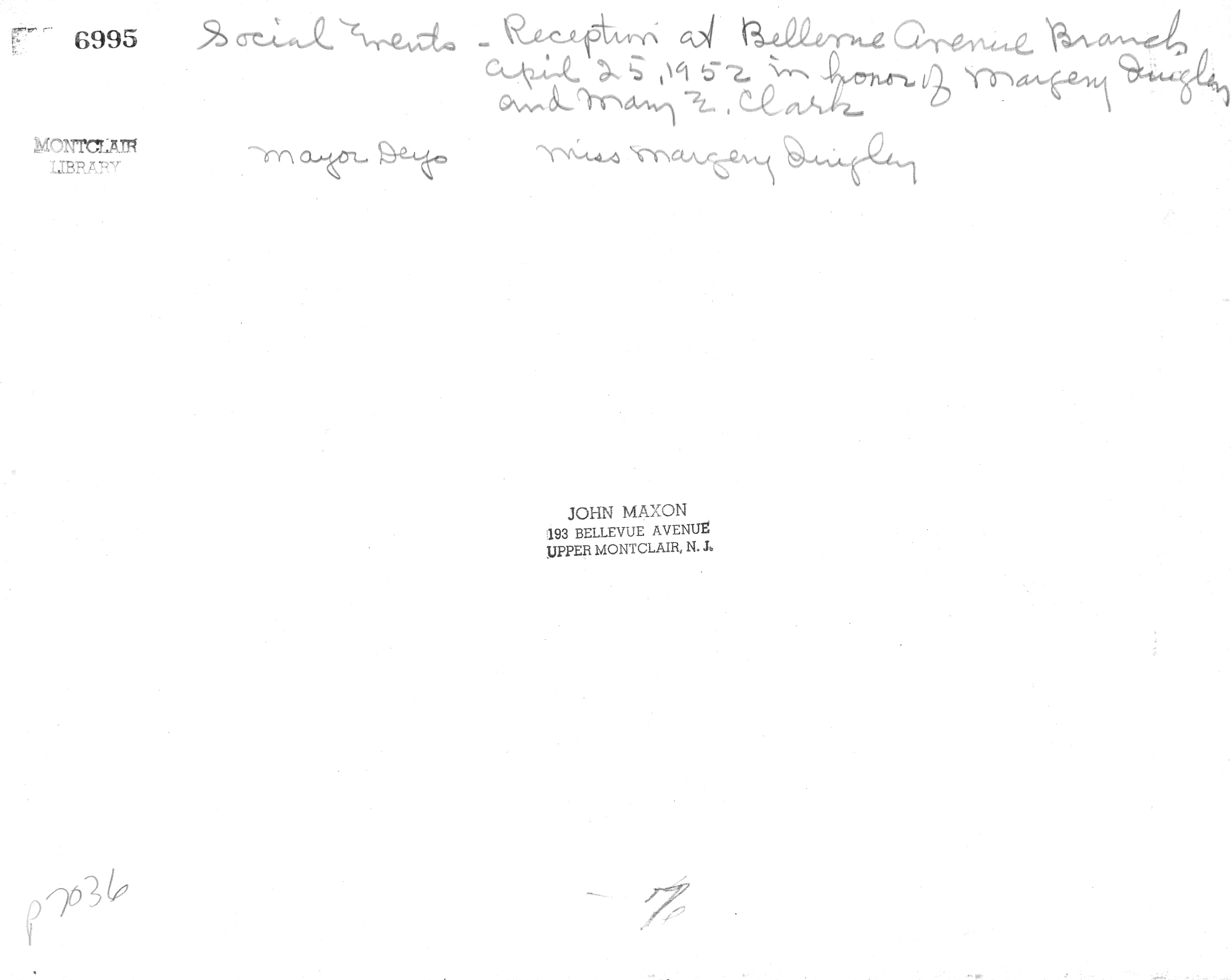 p7036 Buildings & Institutions Libraries Montclair Public Library Bellevue Avenue Branch Upper Montclair Events Library Margery Quigley and Mary E. Clark 25th Anniversary Tea People group portrait Mayor Howard Deyo Margery Quigley Librarians April 25, 1952 Photo by John Maxon
