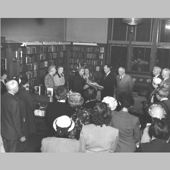 p7038 Buildings & Institutions Libraries Montclair Public Library Bellevue Avenue Branch Upper Montclair Events Library Margery Quigley and Mary E. Clark 25th Anniversary Tea People group portrait April 25, 1952 Photo by John Maxon