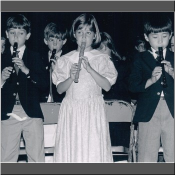 PDS 247 Mag Gilbert, backed up here by a choir of Lower School angels, taught music at MFS and PDS for close to 30 years and composed original songs for school programs. (1980s)