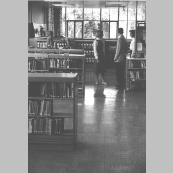 p10043 Buildings & Institutions Libraries Montclair Public Library Fourth Building 50 South Fullerton Avenue Interiors Libraries Young Adult Department People group portrait Library Patrons Photo by Stanley Rice (Harbrace) (From Library Photos Binder 3)