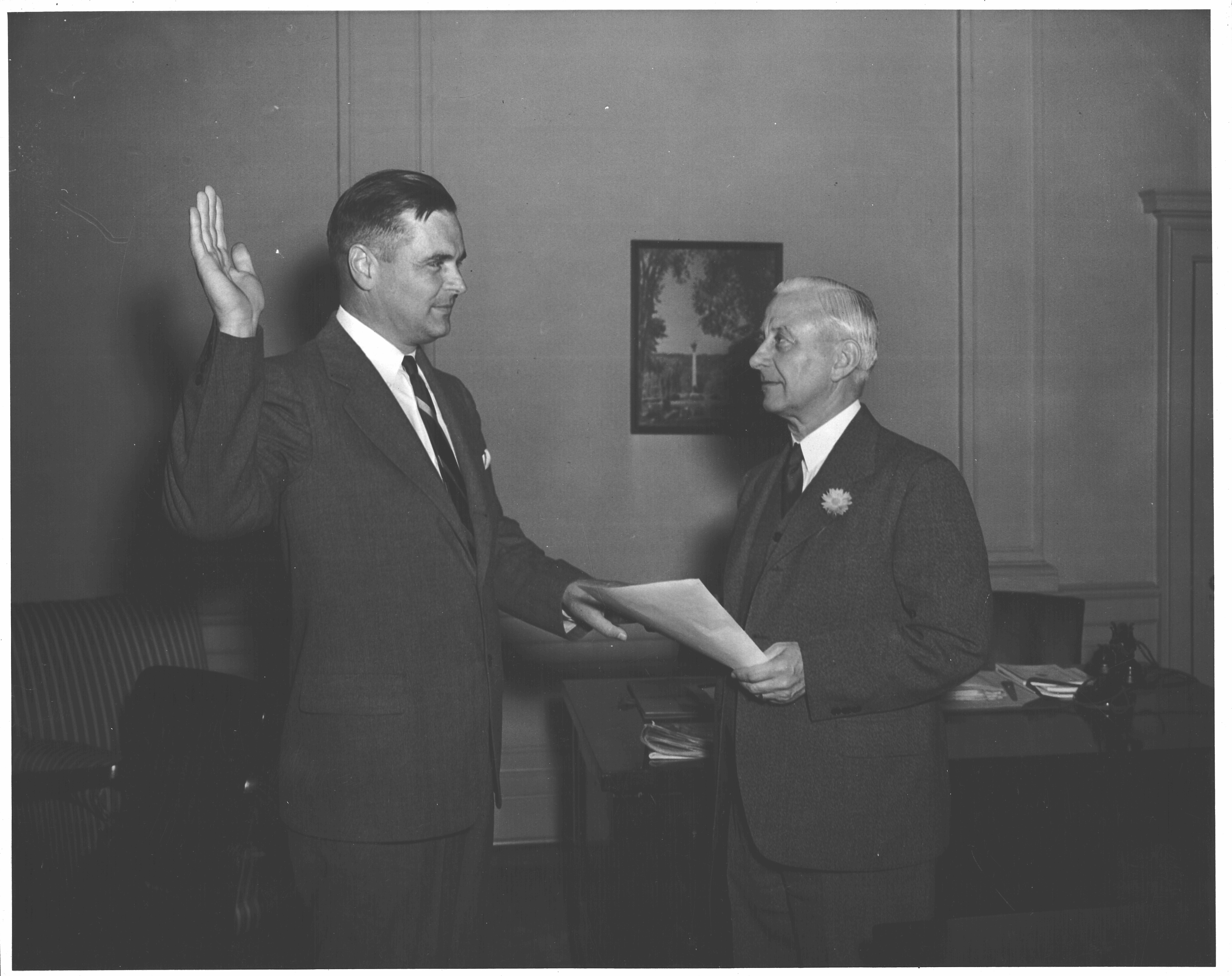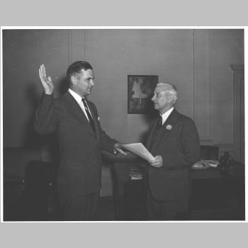 p3126 Government Municipal People group portrait Town Clerk Joseph McKee swearing in Town Commissioners Philip B. Taylor November 3, 1947