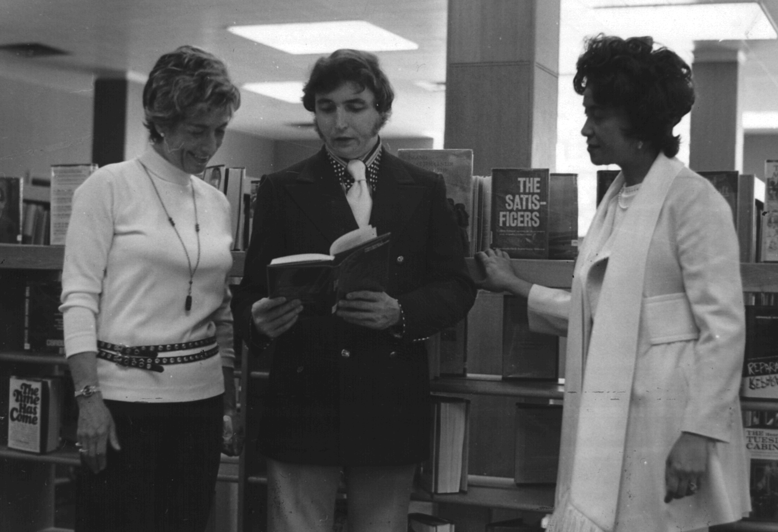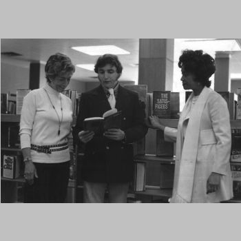 p7127 Buildings & Institutions Libraries Montclair Public Library Fourth Building 50 South Fullerton Avenue Interiors Libraries Events Library "Read and Talk" Book Discussion Group People group portrait Charlotte Kaplowitz Ella Yates Librarians Arthur Curley Library Directors ca. 1971