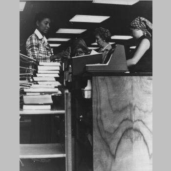 p7132 Buildings & Institutions Libraries Montclair Public Library Fourth Building 50 South Fullerton Avenue Interiors Libraries Circulation Desk People group portrait Mrs. W. Standi ca. 1976