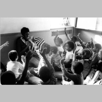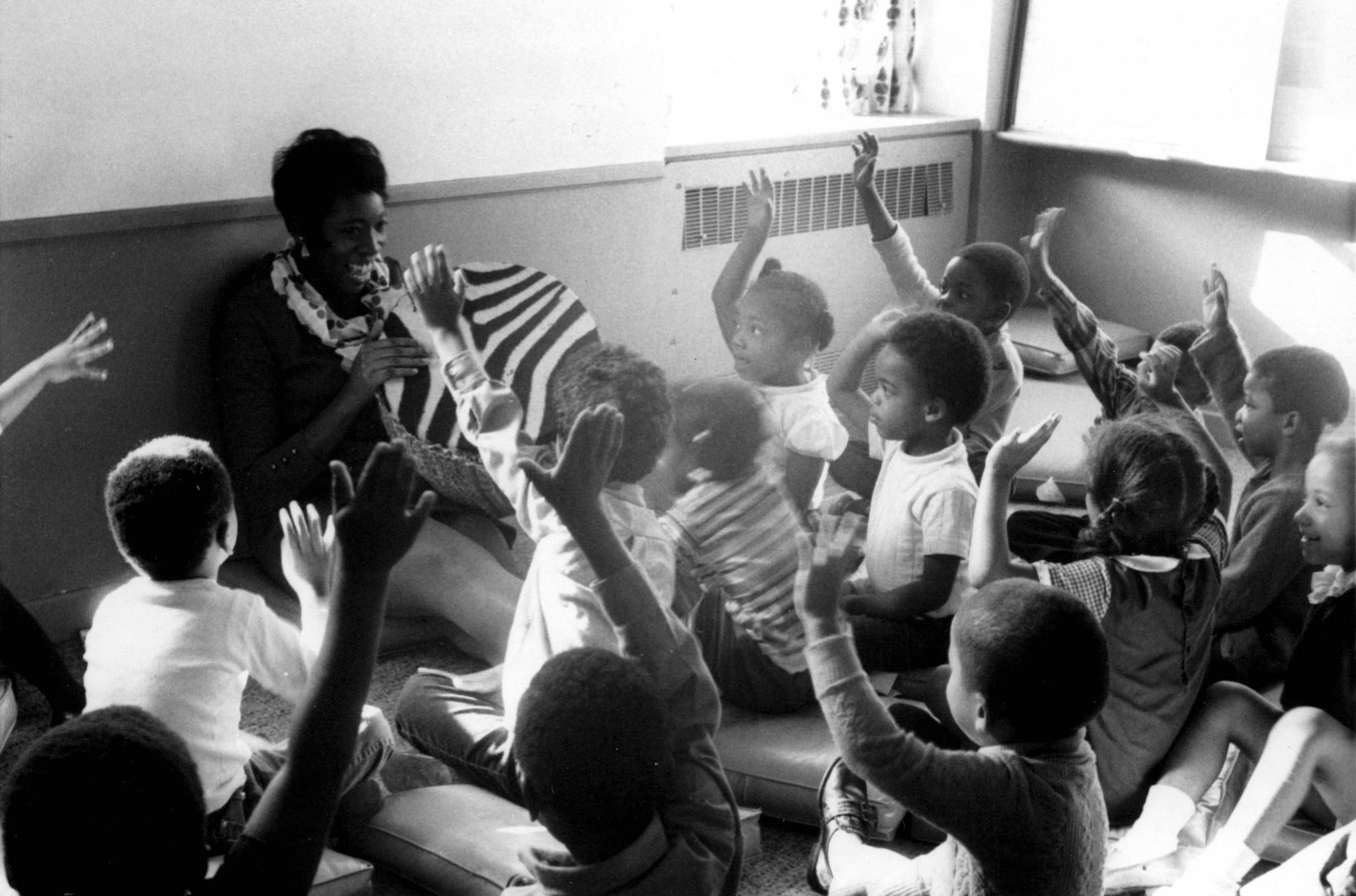 p9136 Buildings & Institutions Libraries Montclair Public Library Fourth Building 50 South Fullerton Avenue Interiors Libraries People group portrait Daisy Hightower Librarians Events Special "Head Start Children Story Hours" Fall 1970