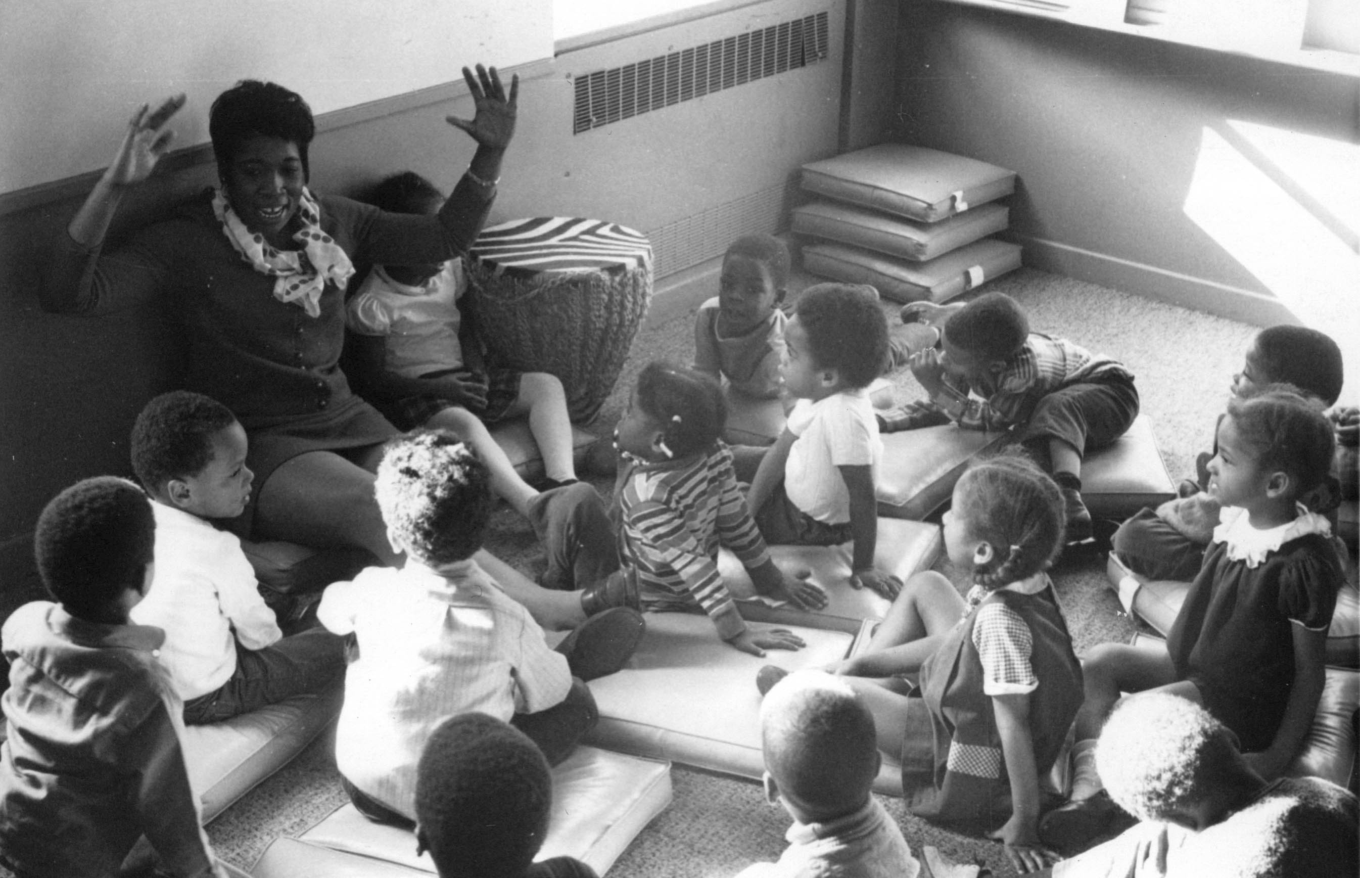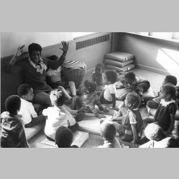 p9140 Buildings & Institutions Libraries Montclair Public Library Fourth Building 50 South Fullerton Avenue Interiors Libraries People group portrait Daisy Hightower Librarians Events Special "Head Start Children Story Hours" Fall 1970