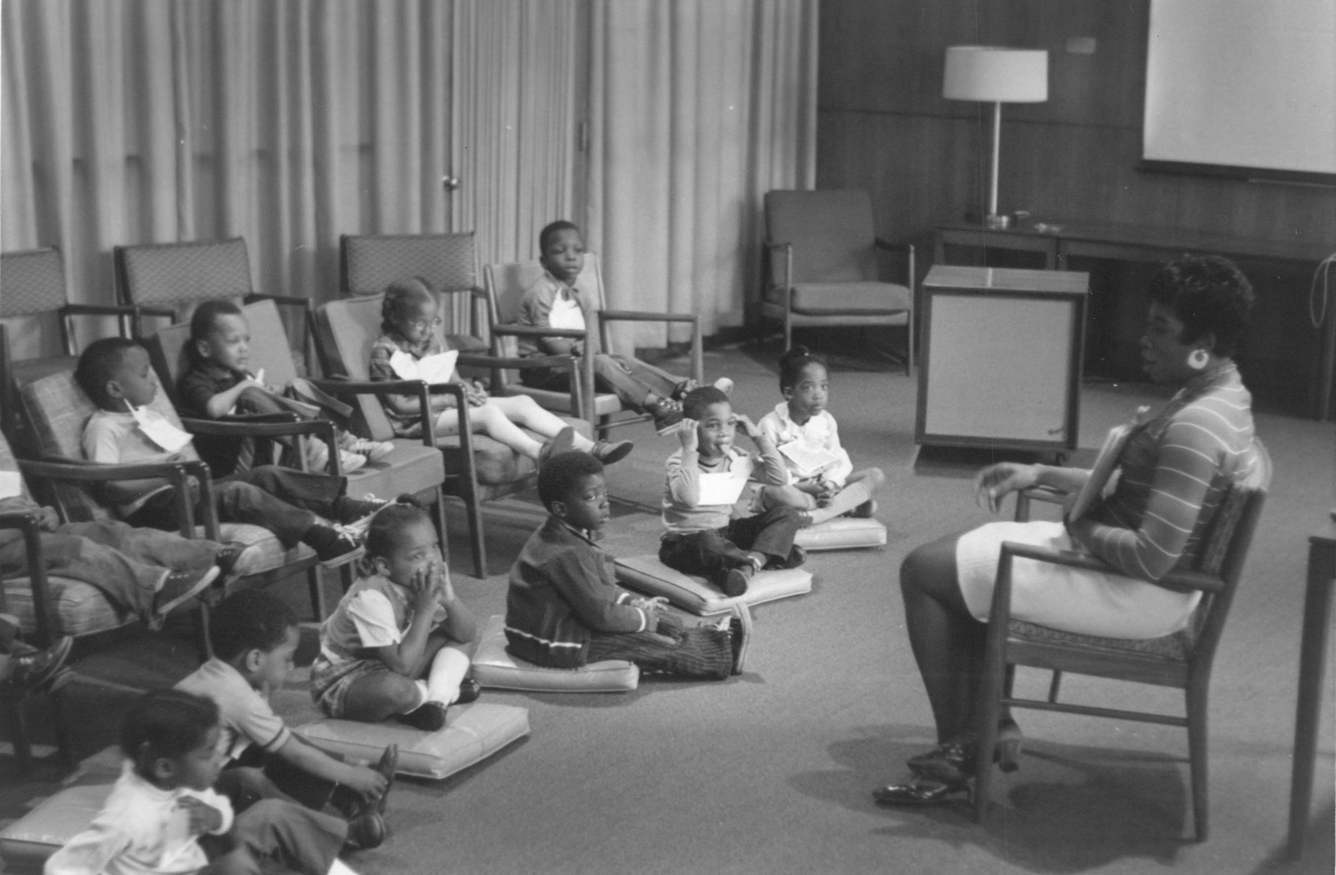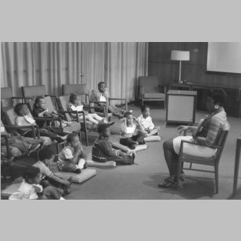 p9141 Buildings & Institutions Libraries Montclair Public Library Fourth Building 50 South Fullerton Avenue Interiors Libraries People group portrait Daisy Hightower Librarians Events Special "Head Start Children Story Hours" May 1971