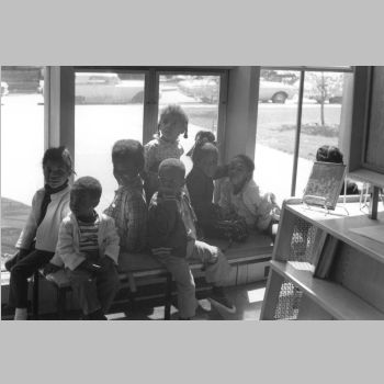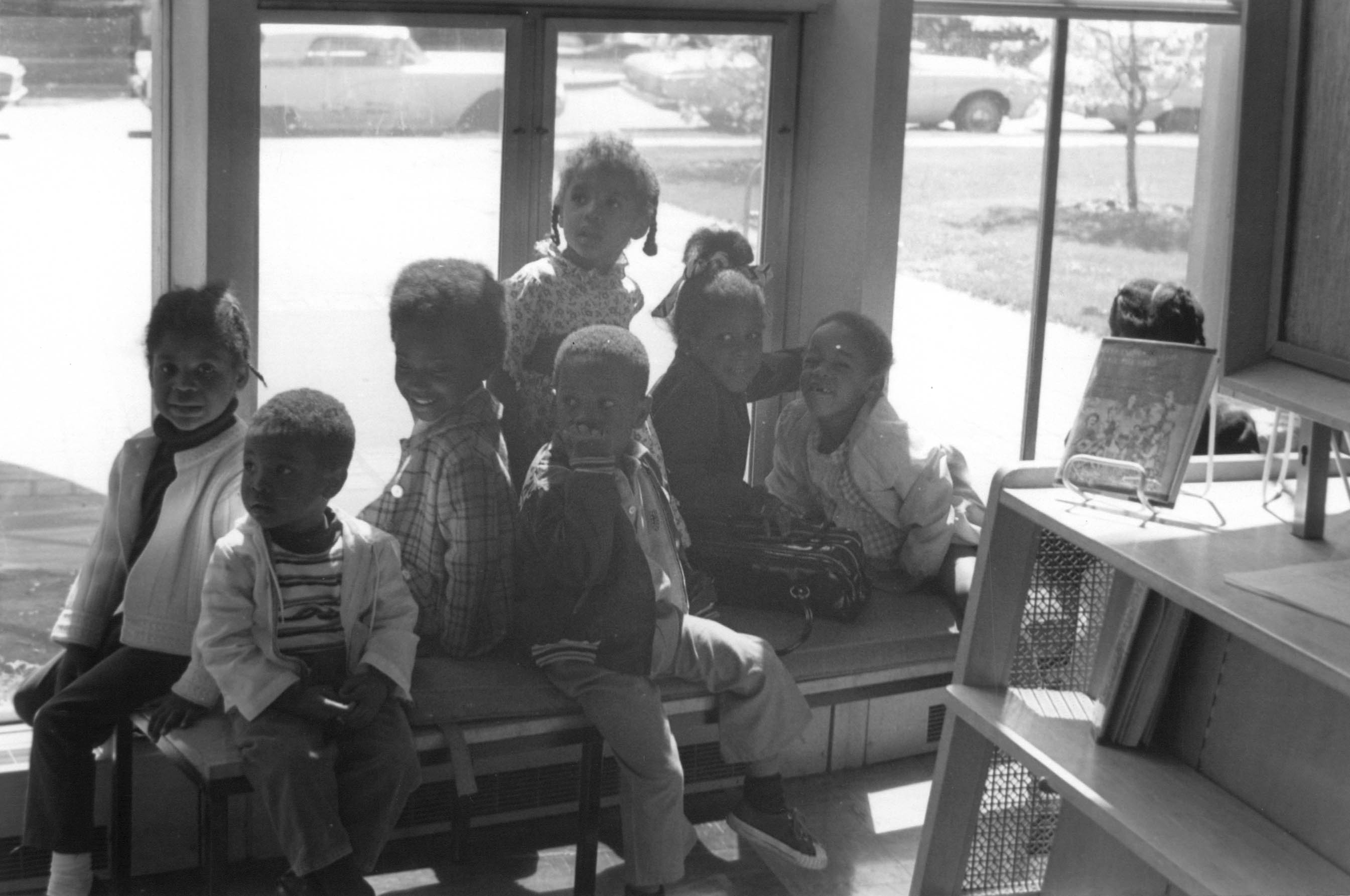 p9142 Buildings & Institutions Libraries Montclair Public Library Fourth Building 50 South Fullerton Avenue Interiors Libraries People group portrait Daisy Hightower Librarians Events Special "Head Start Children Story Hours" May 1971