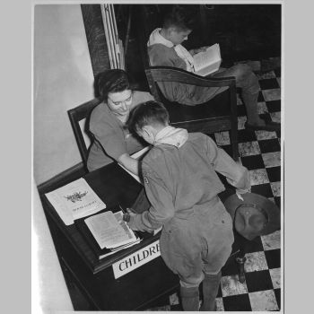 p651 Buildings & Institutions Libraries Montclair Public Library Third Building Church Street Interiors Libraries People group portrait Boy Scouts ca. 1945