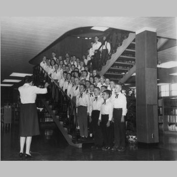 p2076 Buildings & Institutions Libraries Montclair Public Library Fourth Building 50 South Fullerton Avenue Interiors Libraries Schools Public Elementary People Children group portrait Sixth Grade Carol Sing Events Holidays Christmas December 20, 1961
