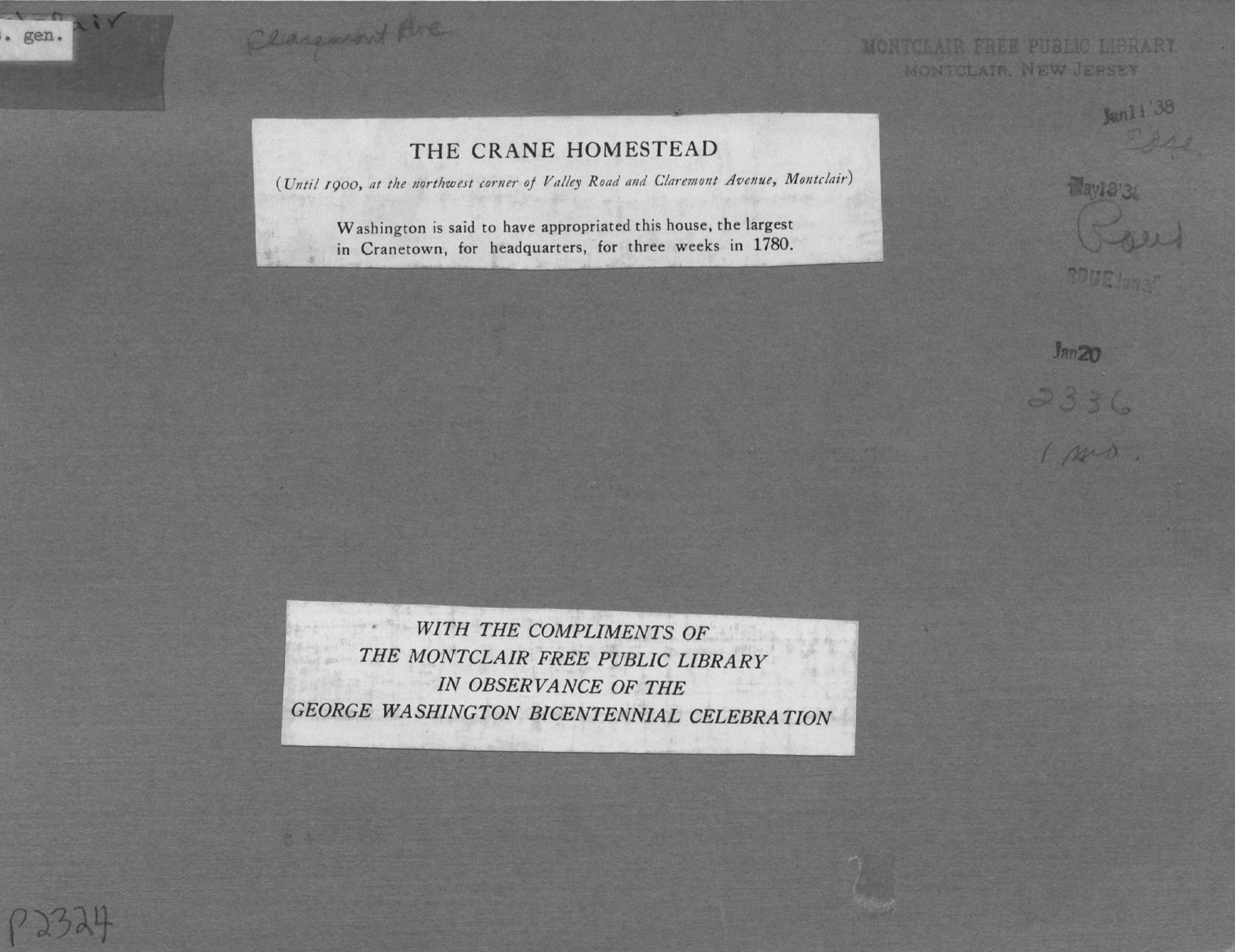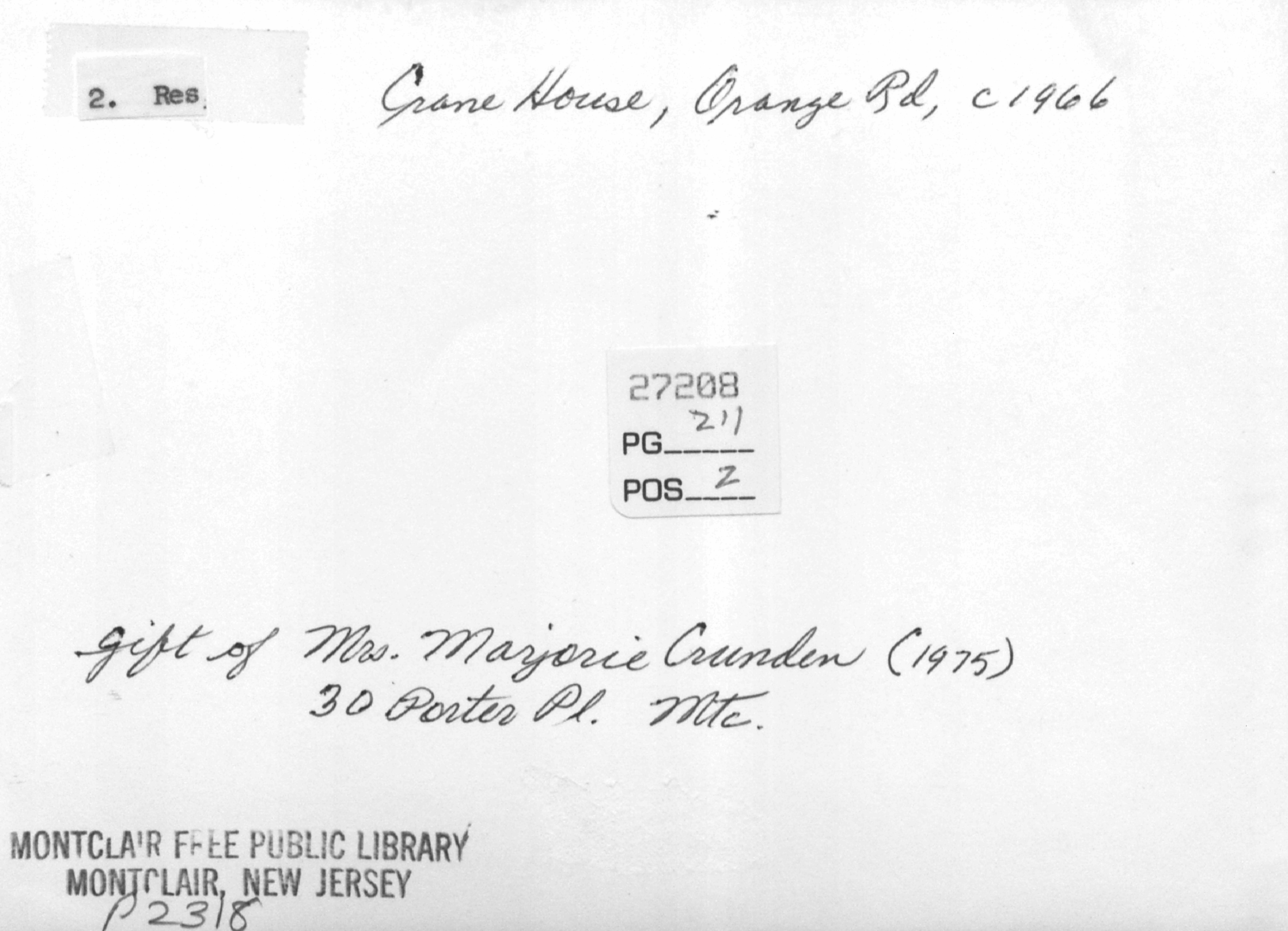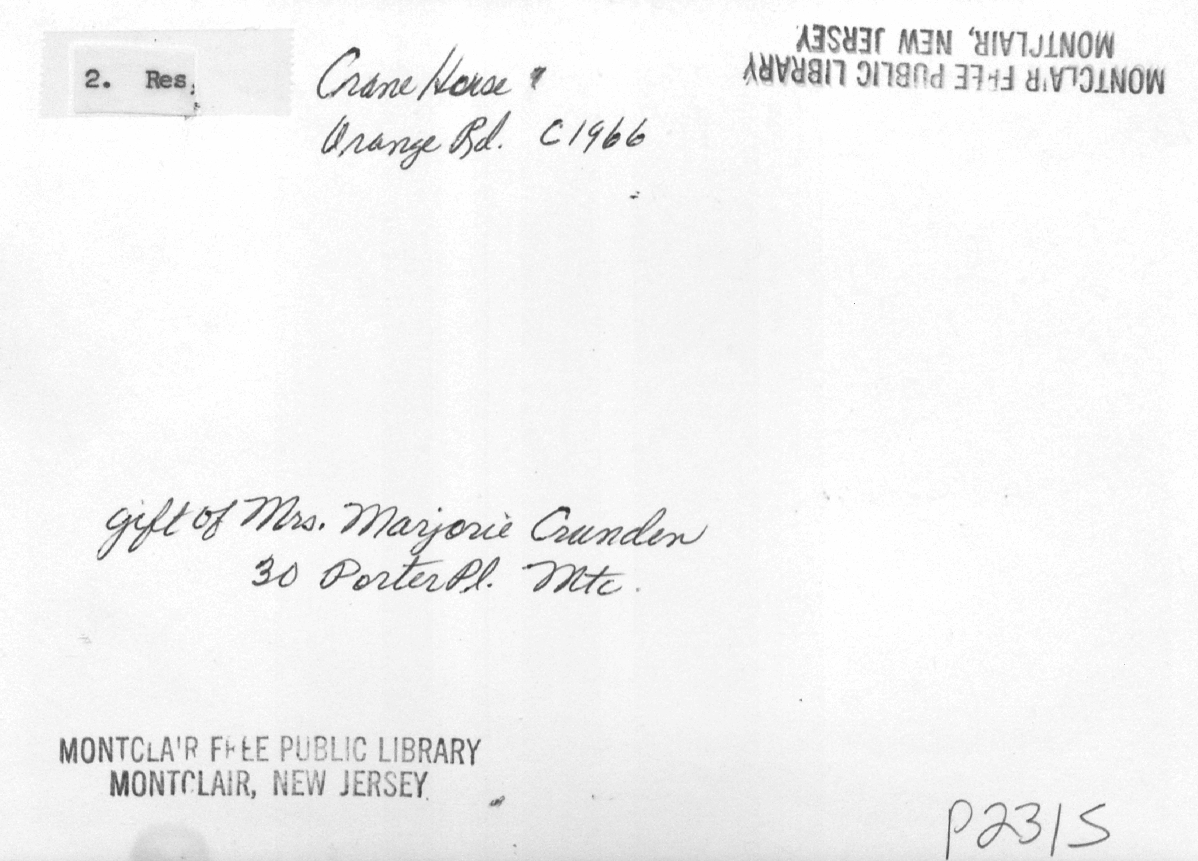 Israel Crane's Residence (Montclair Historical Society) ca. 1965