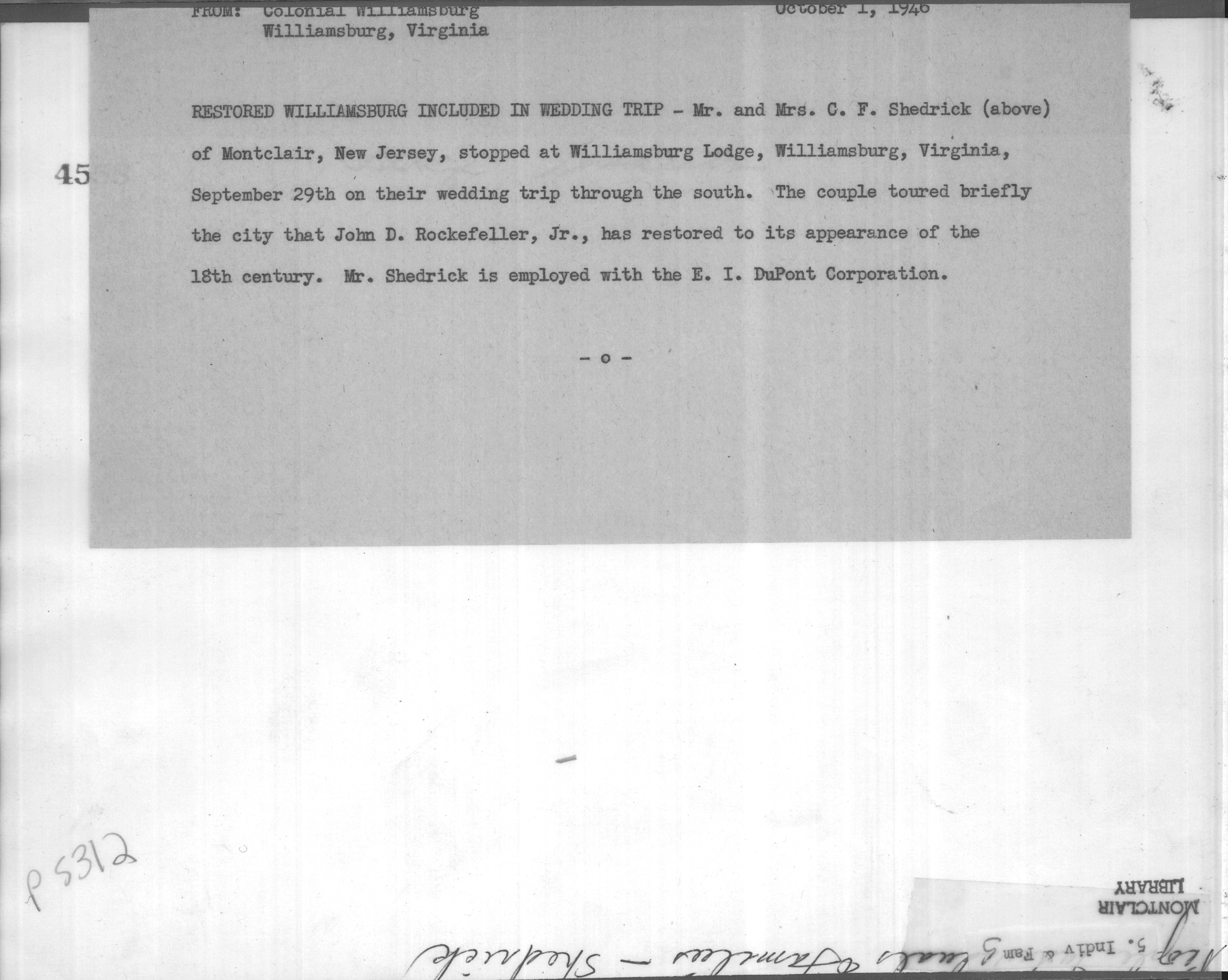 Mr. & Mrs. C. F. Shedrick Williamsburg VA October 1941