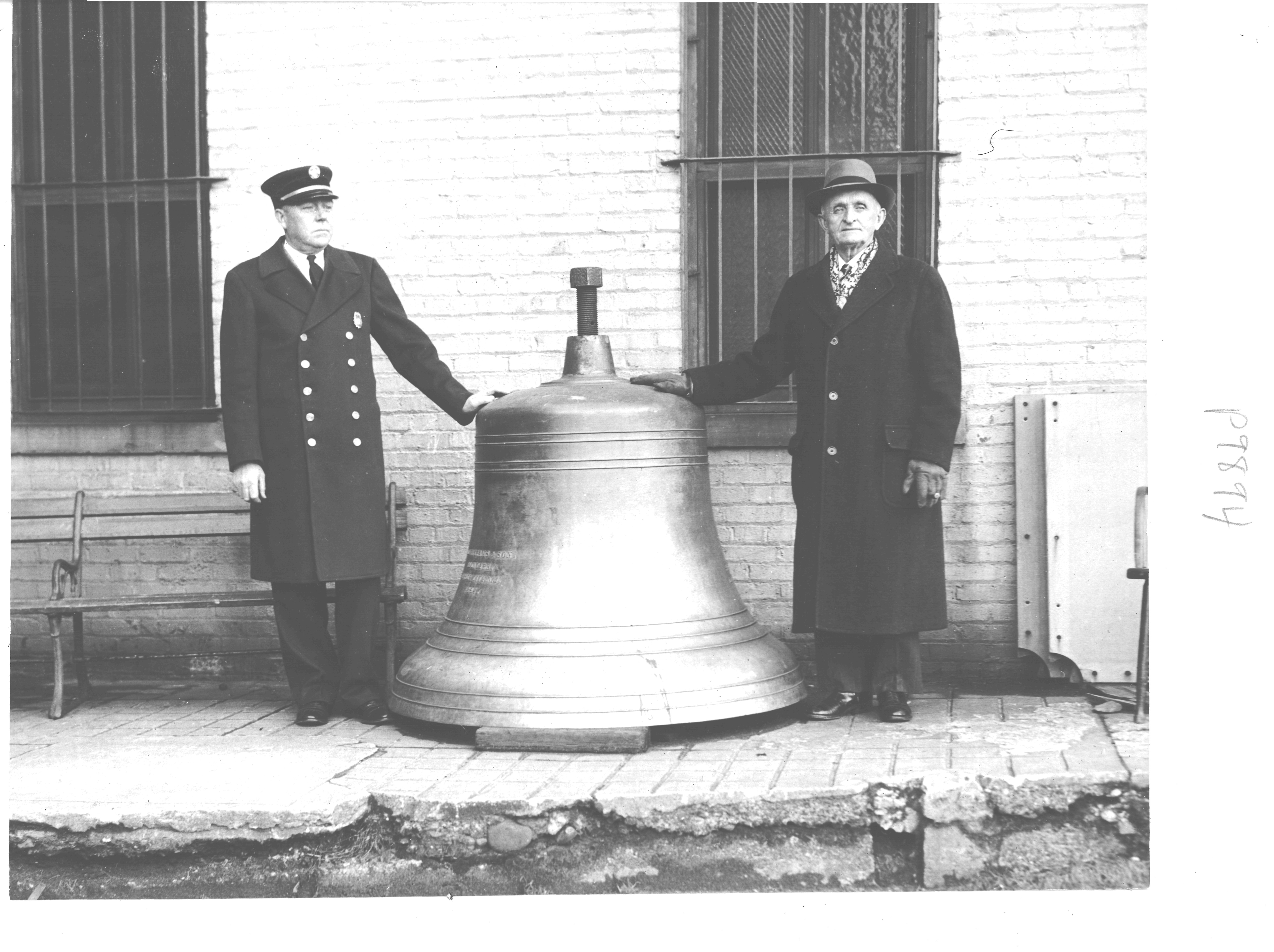 Fire Chiefs Arthur W. Bilby and Ex-Chief Gibbs with Fire Alarm Bell which was donated to World War II scrap drive in 1942(From Decades Book Vol 11 1940-1949)